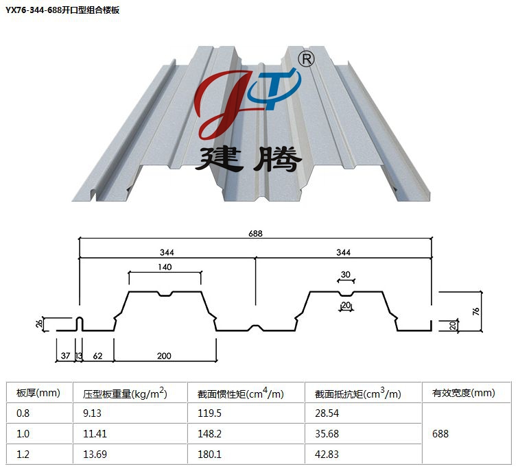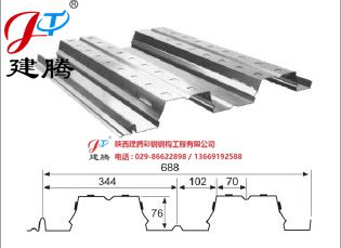 688型樓承板,指的是YX76-344-688樓承板。它是開口式樓承板的型號,其中688代表的是樓承板的有效寬度,即YX76-344-688樓承板,它是用1米寬度的鍍鋅板 壓型而成的,其常見的厚度有0.8mm、1.0mm、1.2mm。其中“76“是波高 , ”344 “是波距, ”688 “是有效寬度 。688型樓承板是最早的一批樓承板型號,其優(yōu)點是施工速度快,承載能力強,抗震效果好。所以時代再怎么發(fā)展,688型樓承板也不會被淘汰。